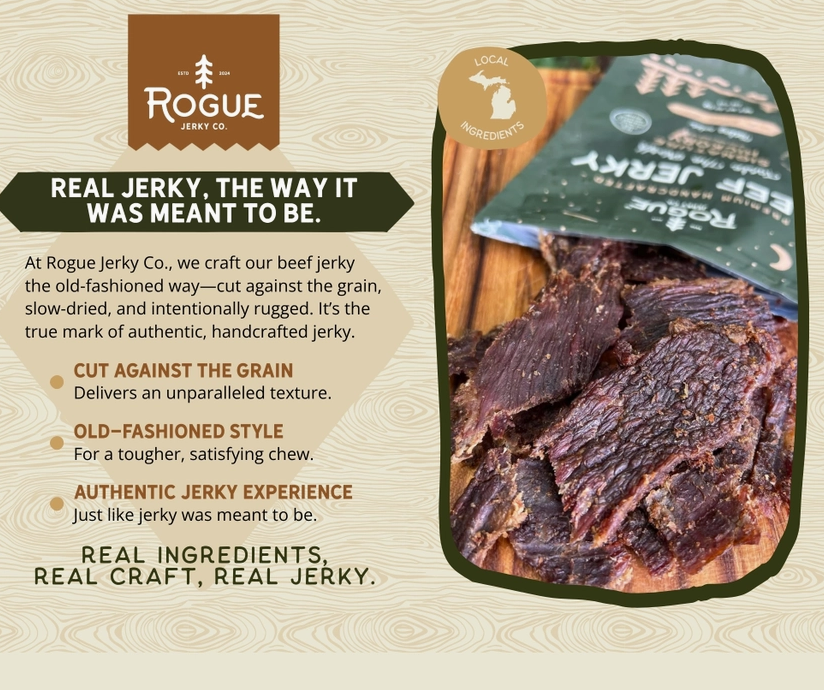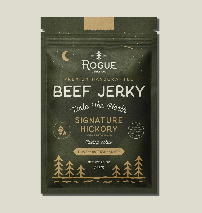 Signature Hickory Beef Jerky: a bold, savory punch of smoky hickory, sea salt, garlic, and onion, rounded out with a subtle hint of rosemary for depth. Expect a rugged, satisfying chew and a classic, old-school jerky flavor that’s rich, hearty, and genuinely beef-forward.