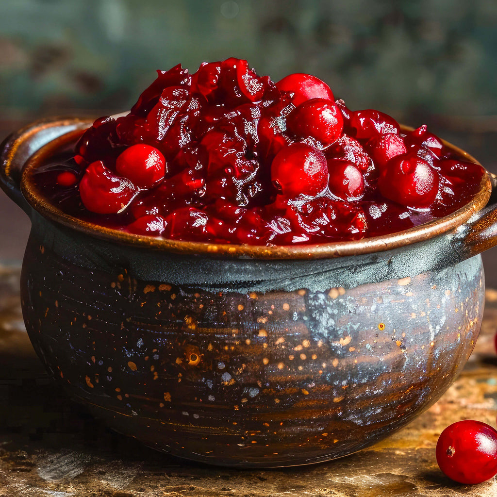 Slow simmered cranberries with sugar, orange zest and a touch of spices.